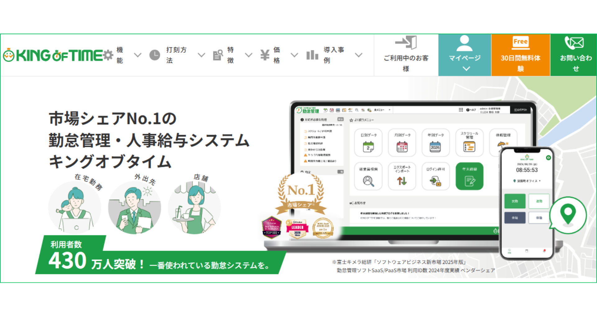 KING OF TIME勤怠管理に特化した高機能なクラウドです。