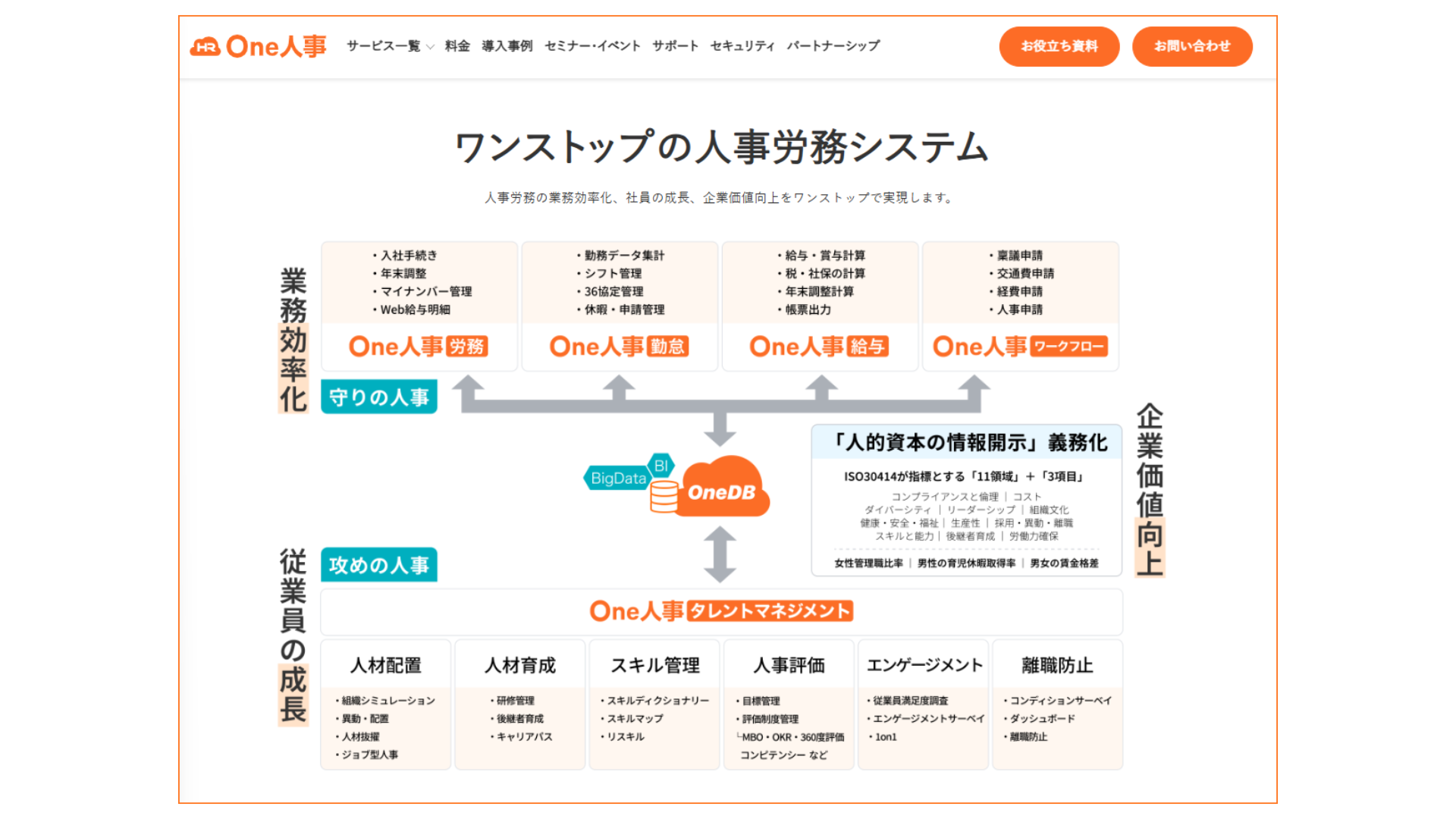 One人事は勤怠・給与・労務・ワークフロー・タレントマネジメントを統合した一元管理型のクラウドです。