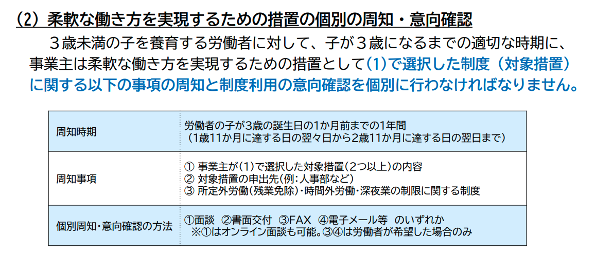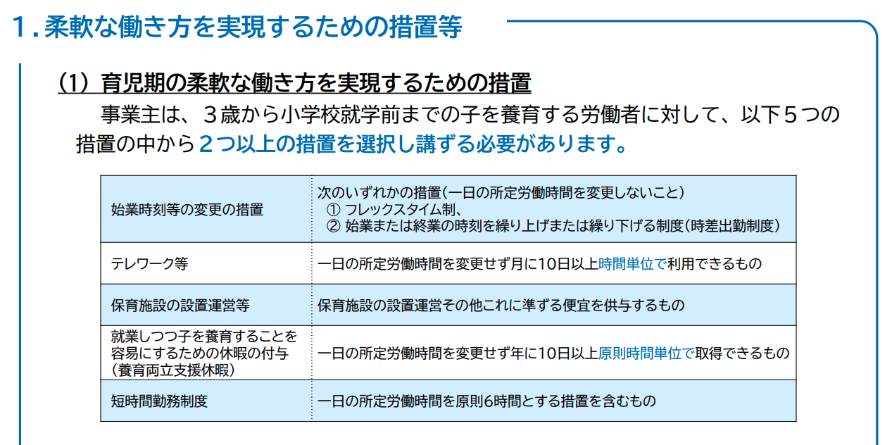 事業主は、3歳から小学校就学前までの子を養育する労働者に対して、休暇制度も含め5つの 措置の中から2つ以上の措置を選択し講ずる必要があります。