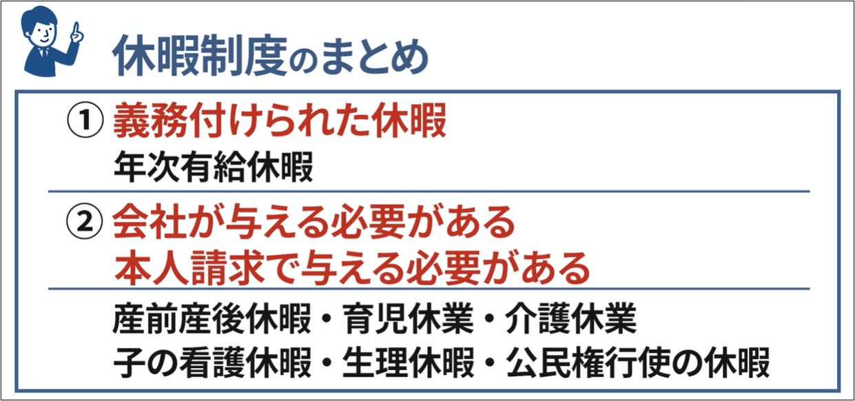 まずは、法律で定められている主要な休暇から見ていきましょう。