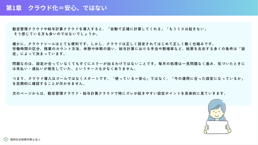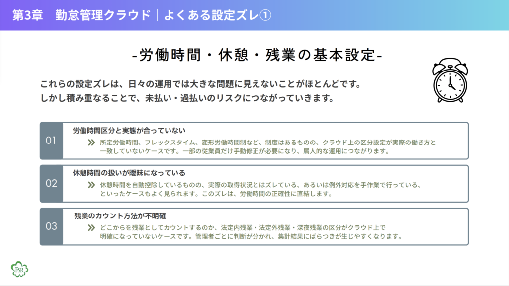 本資料では、社労士の実務視点から勤怠・給与クラウドでよくある設定ミスと、正しい労務管理につなげる考え方を分かりやすく整理しています。